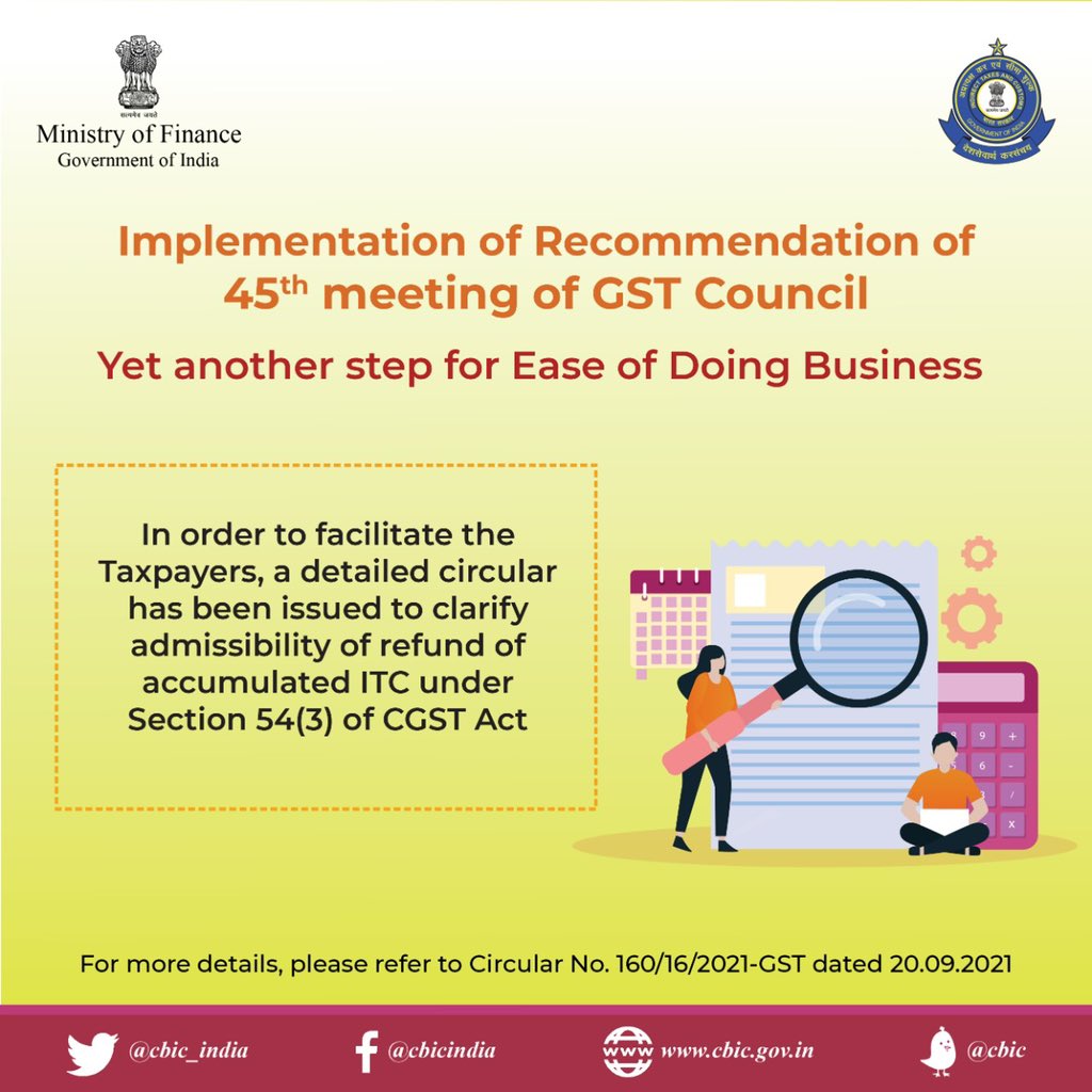Cbic On Twitter Recommendation Of 45th Gst Council Meeting Detailed Circular Issued To Clarify Admissibility Of Refund Of Accumulated Itc Under Section 54 3 Of Cgst Act Link To Circular Https T Co Y0kgxsc9kd Https T Co Mym4ohv0ug